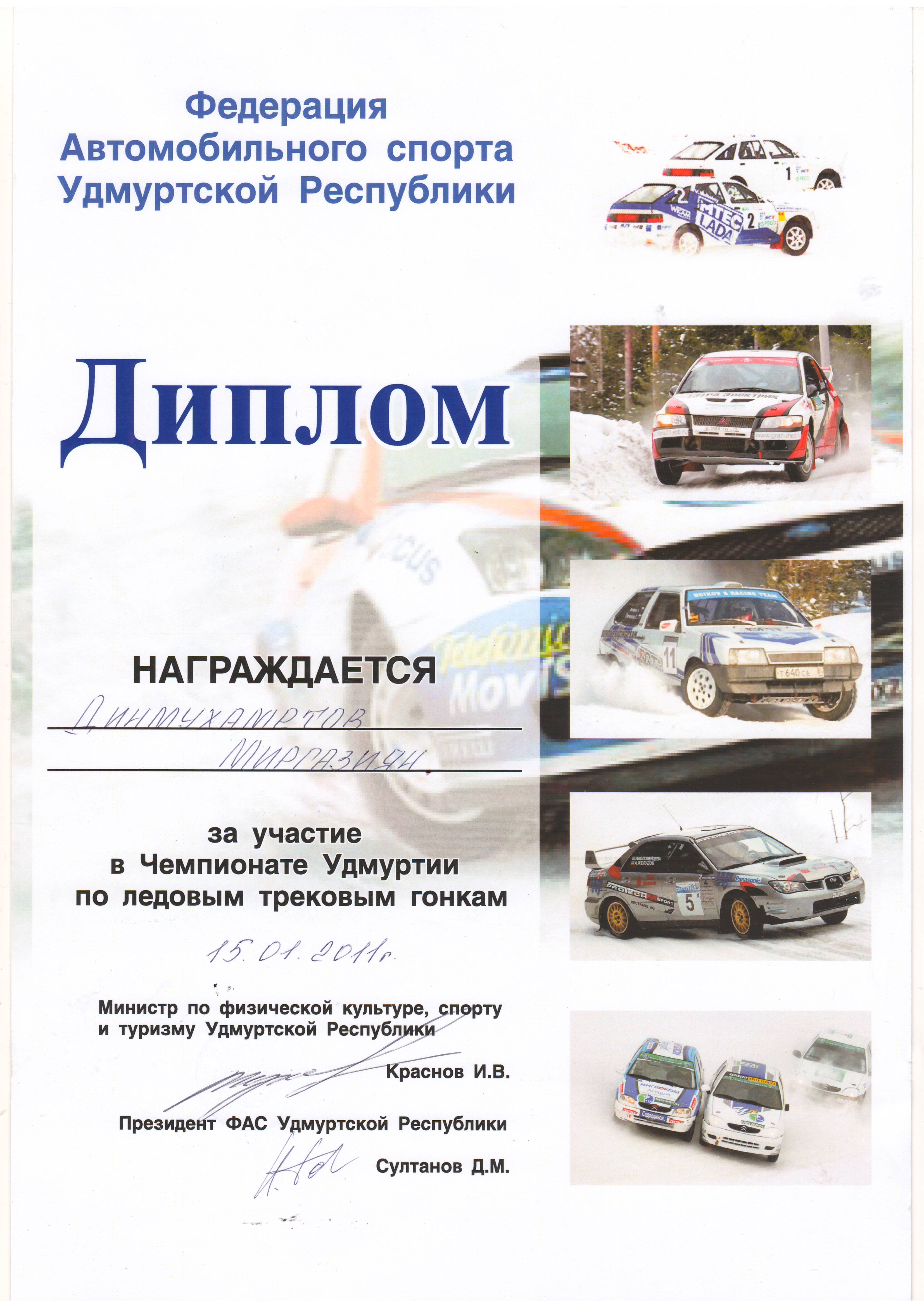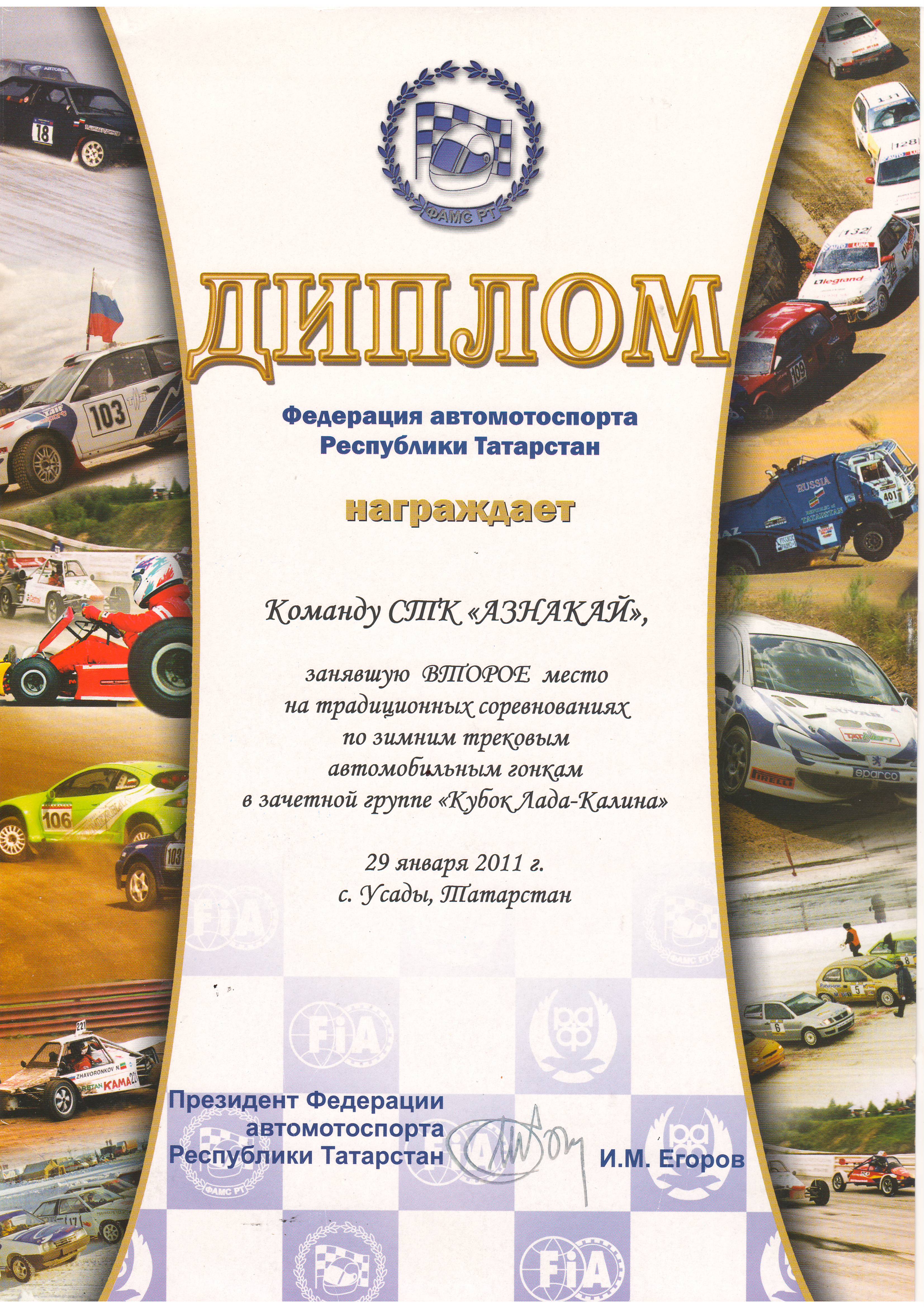 - Второе место на традиционных соревнований по зимним трековым автомобильным гонкам в зачетной группе « Кубок Лада-Калина», 29 января 2011г.с.Усады, Татарстан. .- Динмухаметов Айгиз Миргазиянович