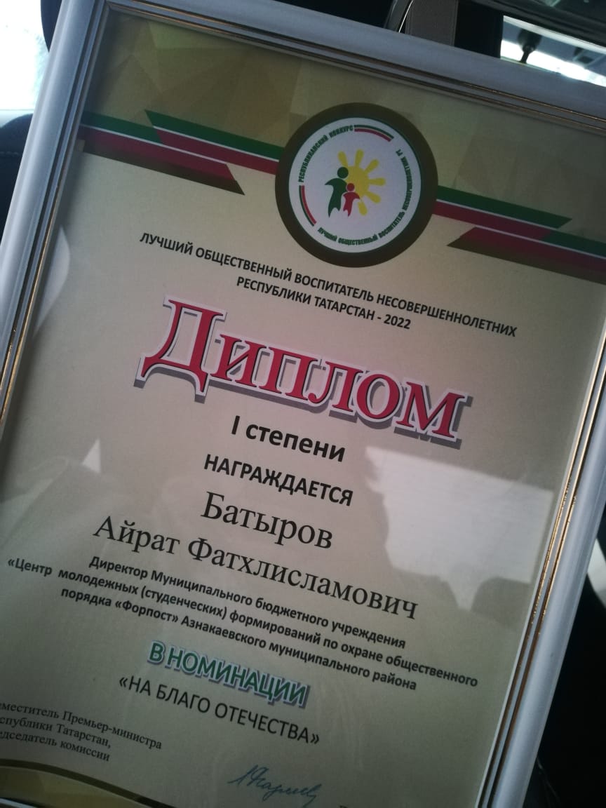 В номинации «На благо Отечества» одержал победу директор МБУ «Центр молодежных формирований по охране общественного порядка Форпост» Азнакаевского района Айрат Батыров.