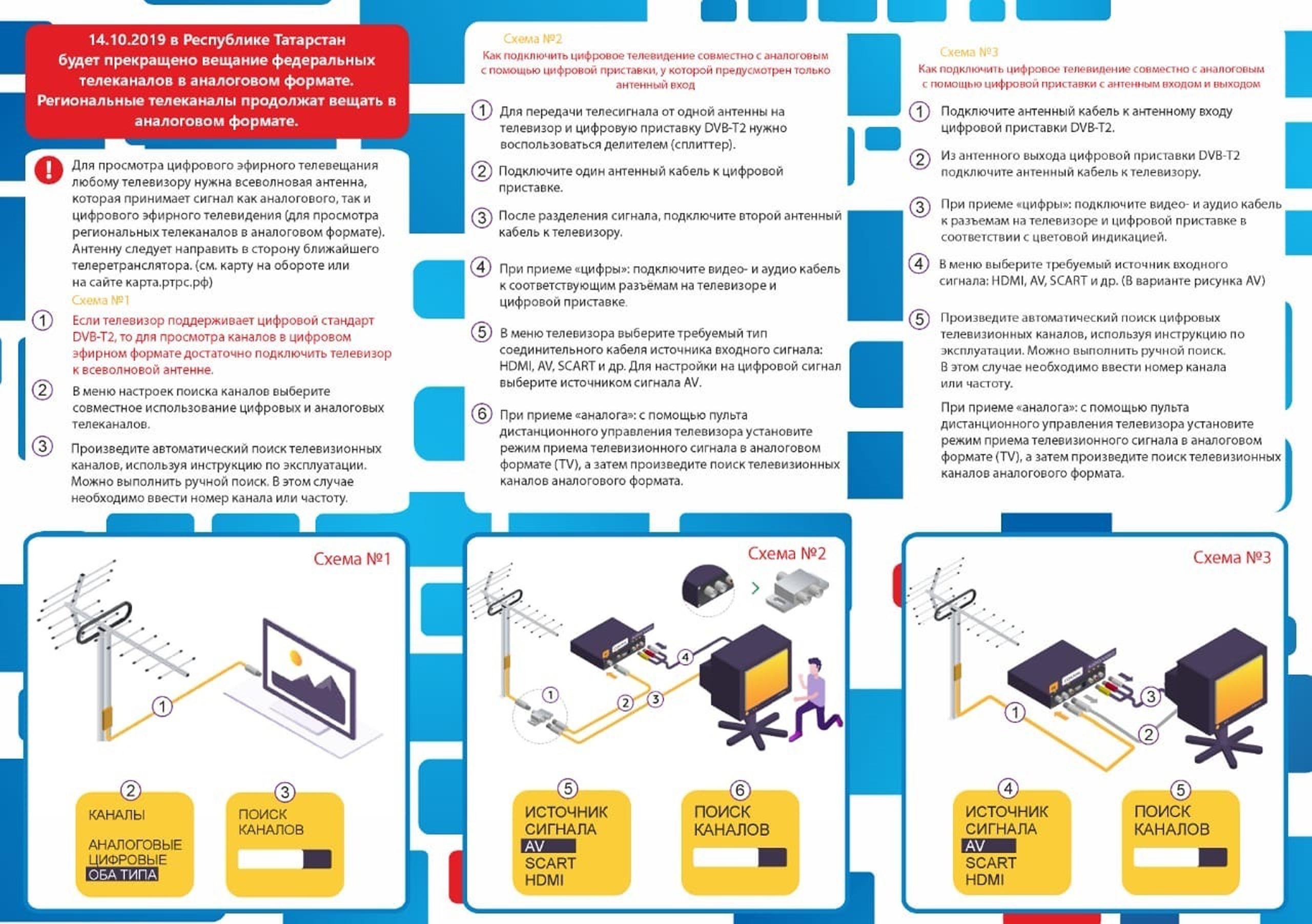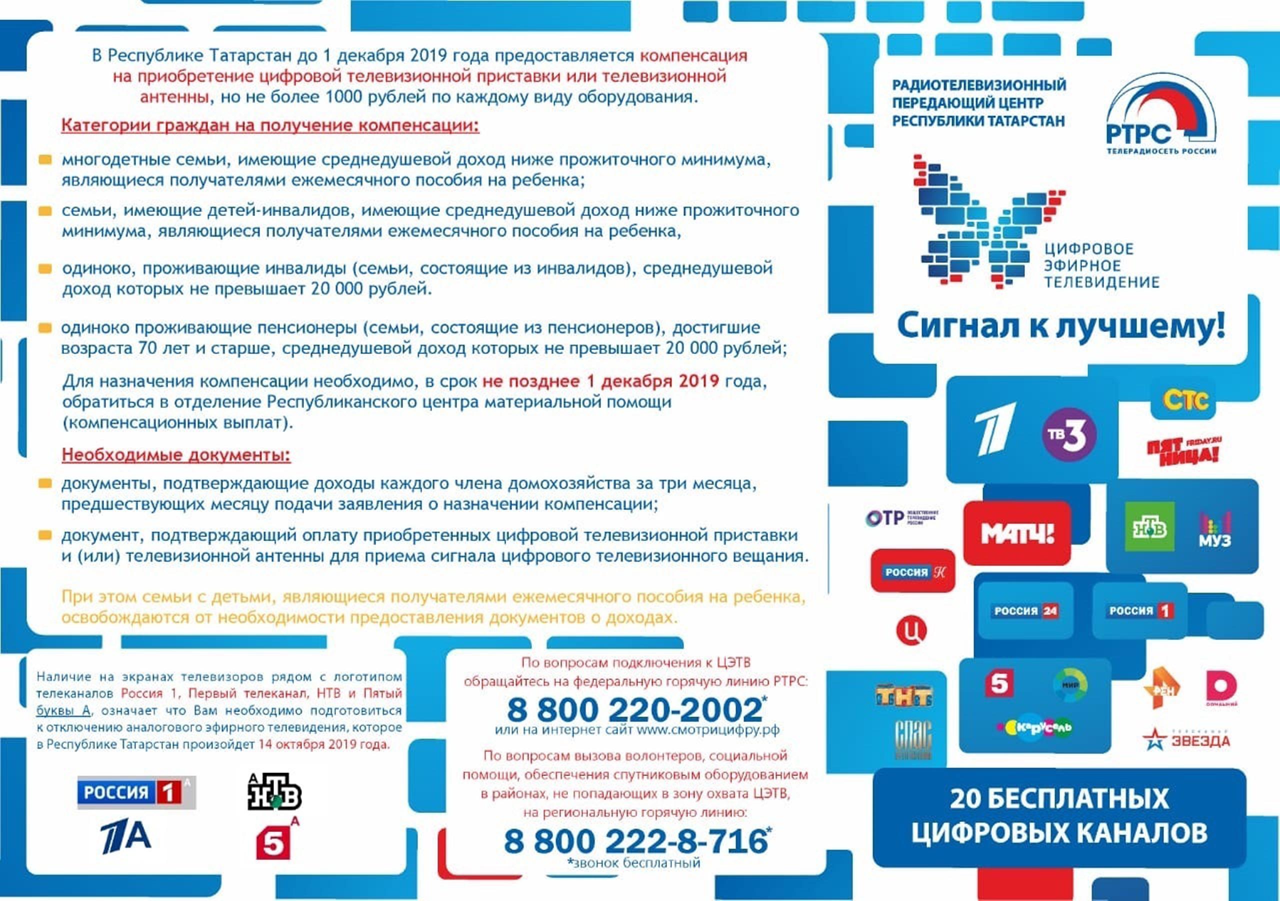 Татарстан перейдет на цифровое ТВ 14 октября. После обращения Рустама Минниханова в адрес правительства РФ дату на октябрь перенесли с 3 июня. Отсрочка не связана с уровнем готовности республики перейти на «цифру», а вызвана проведением в Татарстане мусульманского праздника в июне этого года и желанием властей "учесть интересы населения и не причинять ему значительных неудобств".