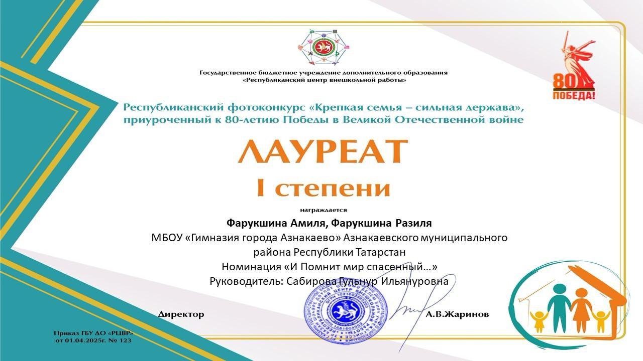 Поздравляем сестёр Фарукшиных Амилю и Разилю, учащихся гимназии города Азнакаево, с достижением звания лауреатов I степени Республиканского конкурса "Крепкая семья - сильная держава"!