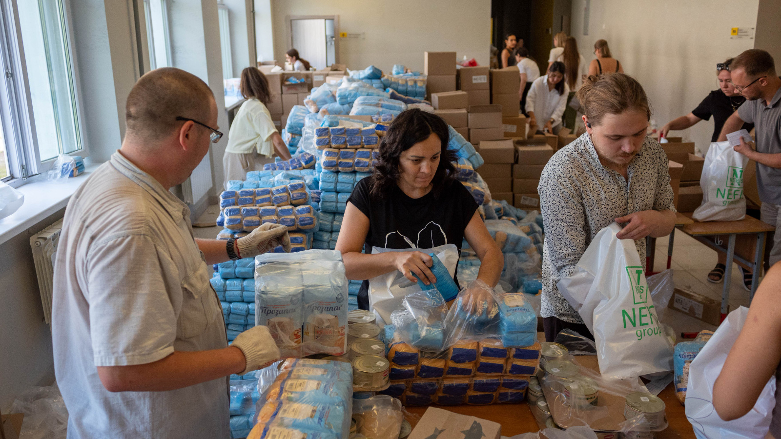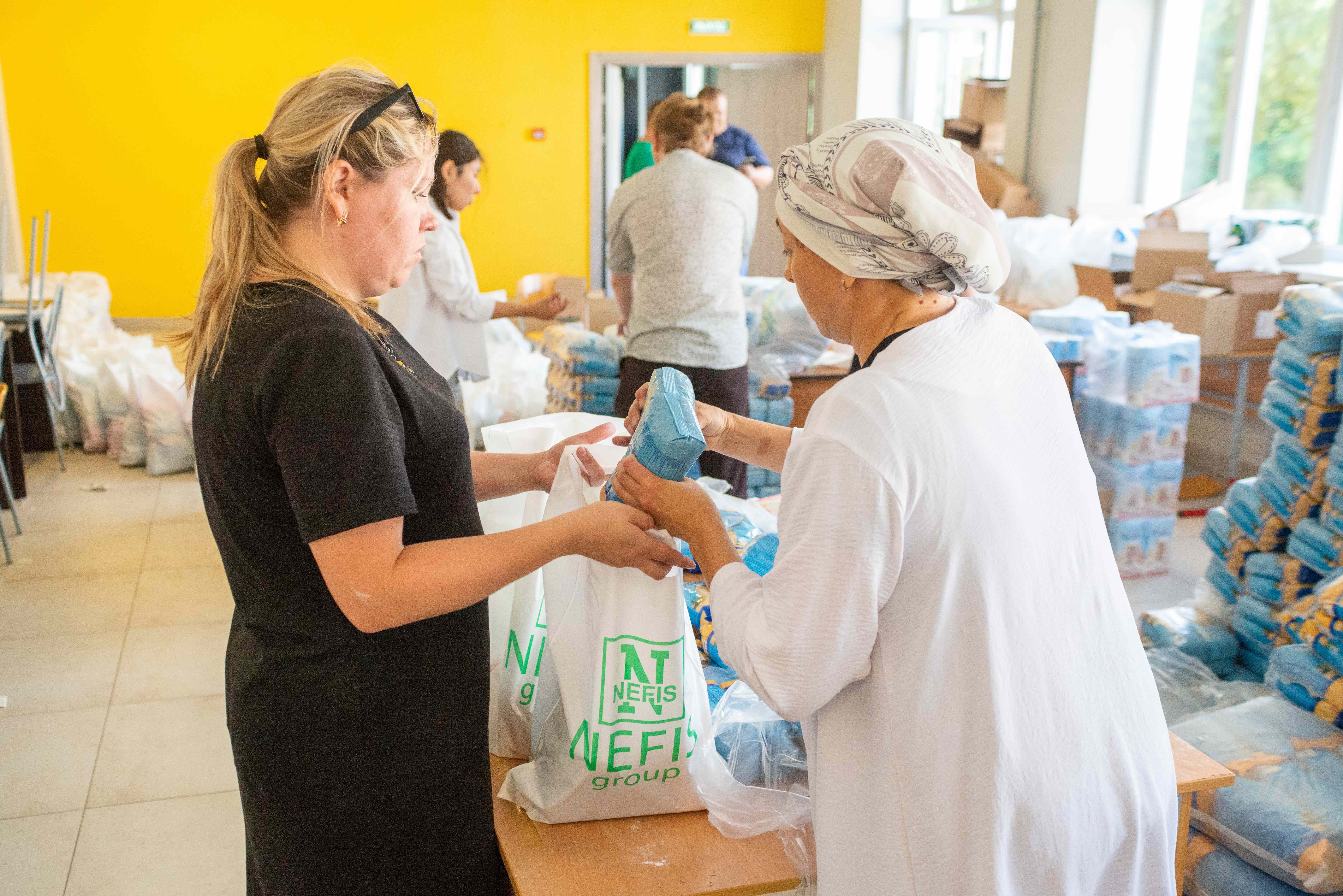 Каждый член семьи участника СВО получает от фонда «Нэфис» набор, в который входят тушенка из говядины, рыбные консервы, сгущенка, различные виды круп, мука, сахар, растительное масло, майонез, кетчуп и другие продукты длительного хранения. В составе бытовой химии – стиральные порошки, жидкости для мытья посуды, сухие чистящие средства, шампунь, мыло (твердое, жидкое, хозяйственное).