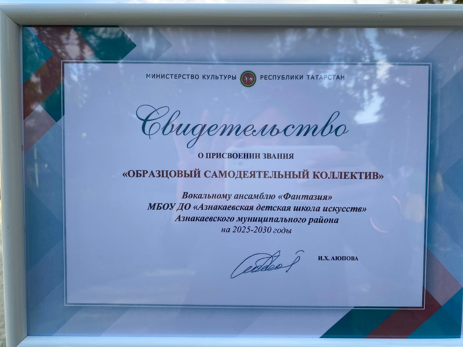 Вокальный ансамбль "Фантазия", под руководством Заслуженного работника культуры Республики Татарстан Эльвиры Ильгизовны Шайхуллиной и концертмейстера Розалии Гаязовны Хабибуллиной из Азнакаевской детской школы искусств, недавно выступил с концертной программой в г. Казани. На этом значимом мероприятии коллектив не только продемонстрировал свой высокий уровень исполнительского мастерства, но и был удостоен Свидетельства о звании "Образцовый вокальный ансамбль"!