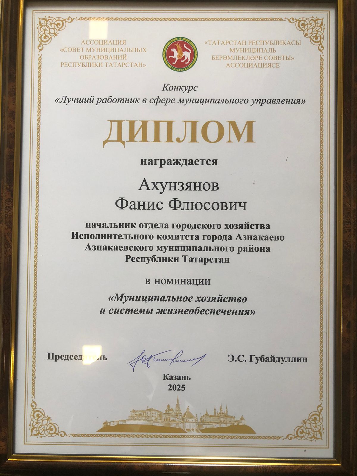 - Фанис Ахунзянов — начальник отдела городского хозяйства Исполнительного комитета города Азнакаево, победитель в номинации «Муниципальное хозяйство и системы жизнеобеспечения»;