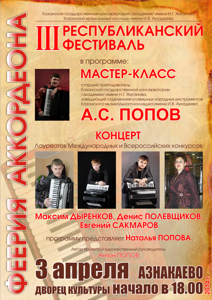 3 апреля в 15.30ч. в Детской школе искусств состоится мастер-класс старшего преподавателя Казанской государственной консерватории /академии/ имени Н.Г.Жиганова, заведующего отделением клавишных народных инструментов Казанского музыкального колледжа имени И.В.Аухадеева Попова Антона с учениками народного отделения.