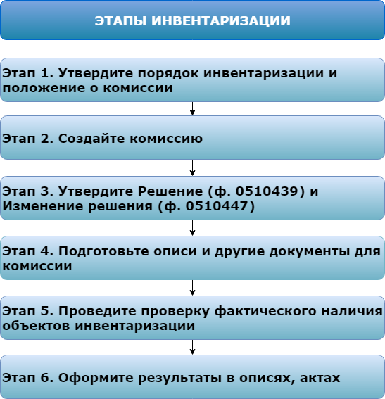 Основные этапы инвентаризации даны в письме Минфина от 01.07.2024 № 02-06-06/61122. Чтобы ознакомится, как действовать на каждом из этапов, кликните по ссылке в схеме.