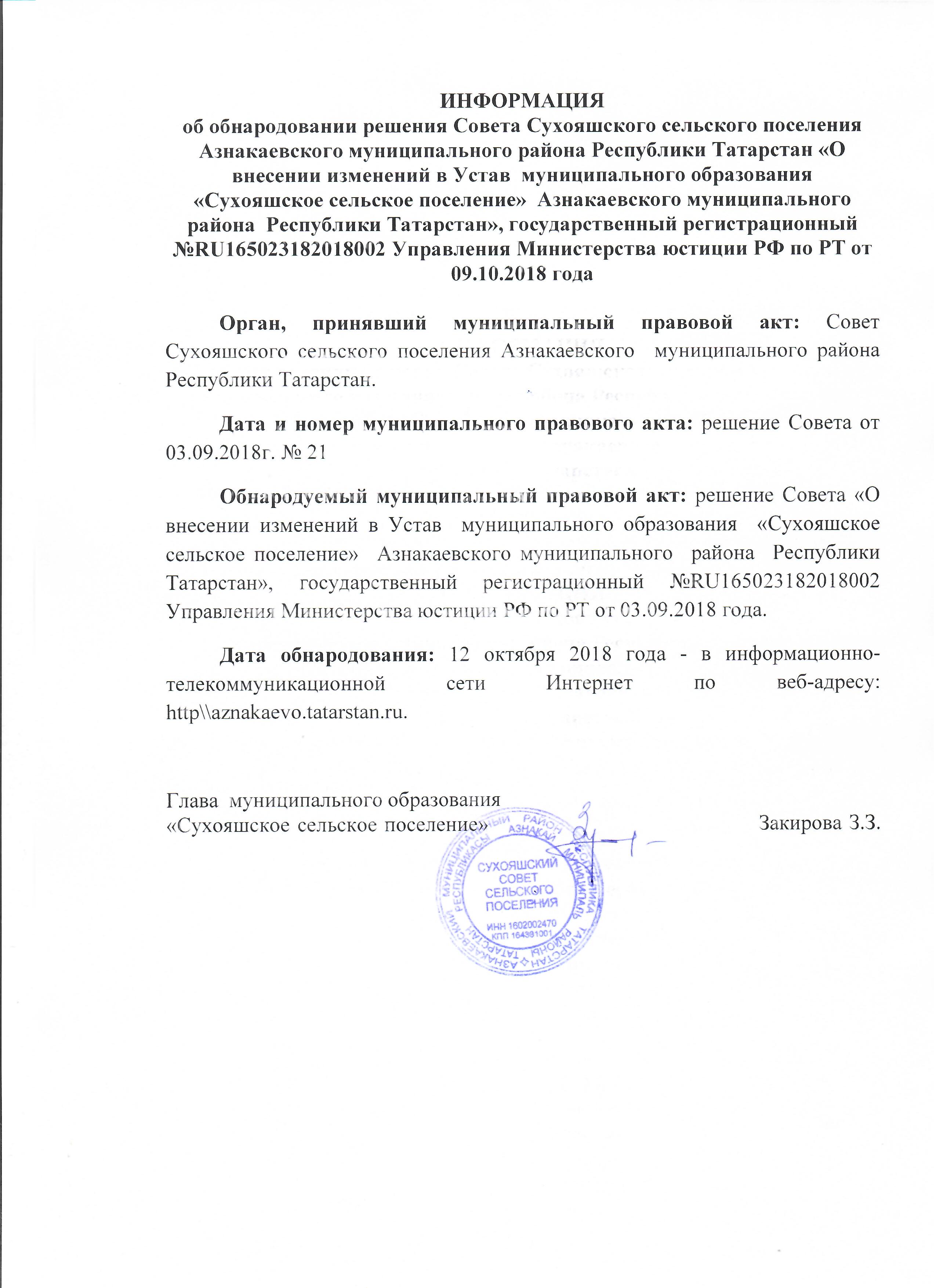 Информация об обнародовании решения Совета Сухояшского сельского поселения Азнакаевского муниципального района Республики Татарстан «О внесении изменений в Устав муниципального образования «Сухояшское сельское поселение» Азнакаевского муниципального района Республики Татарстан», государственный регистрационный №RU165023182018002 Управления Министерства юстиции РФ по РТ от 09.10.2018 года