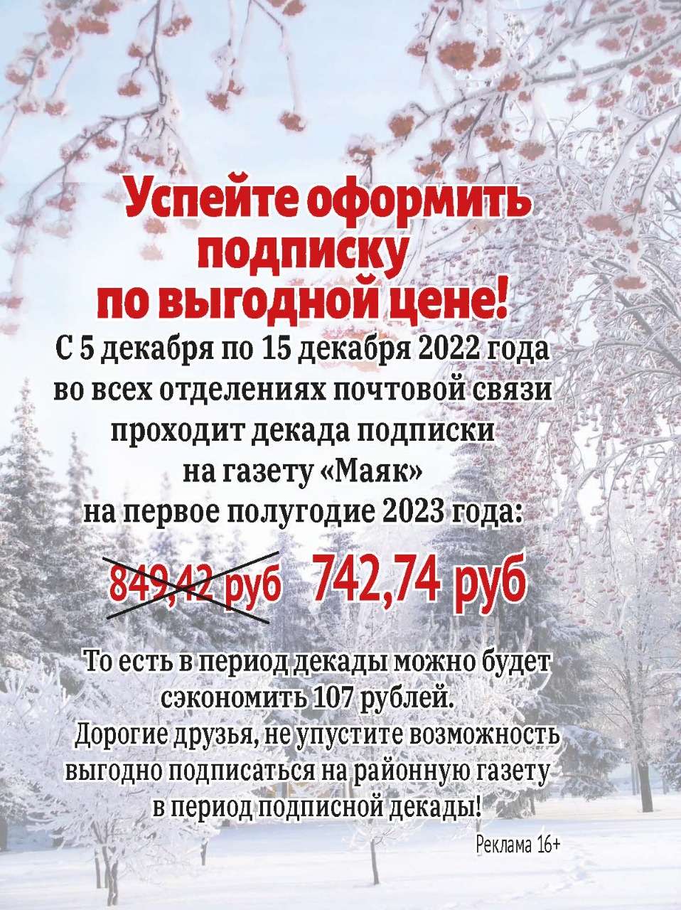Льготная подписка на районную газету "Маяк" на 1 полугодие 2023года