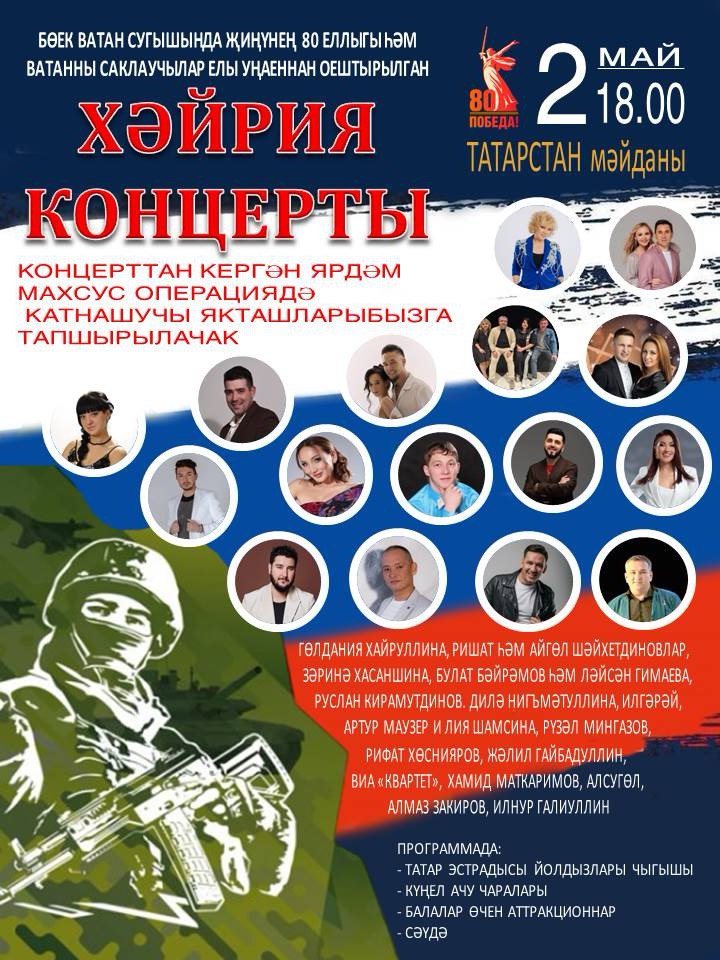 2025 елнын 2 май көнне Азнакайда Бөек Ватан сугышында жинунең 80еллыгы Һәм ватанны саклаучылар елы уңаеннан оештырылган хэйрия концертына рэхим итегез.
