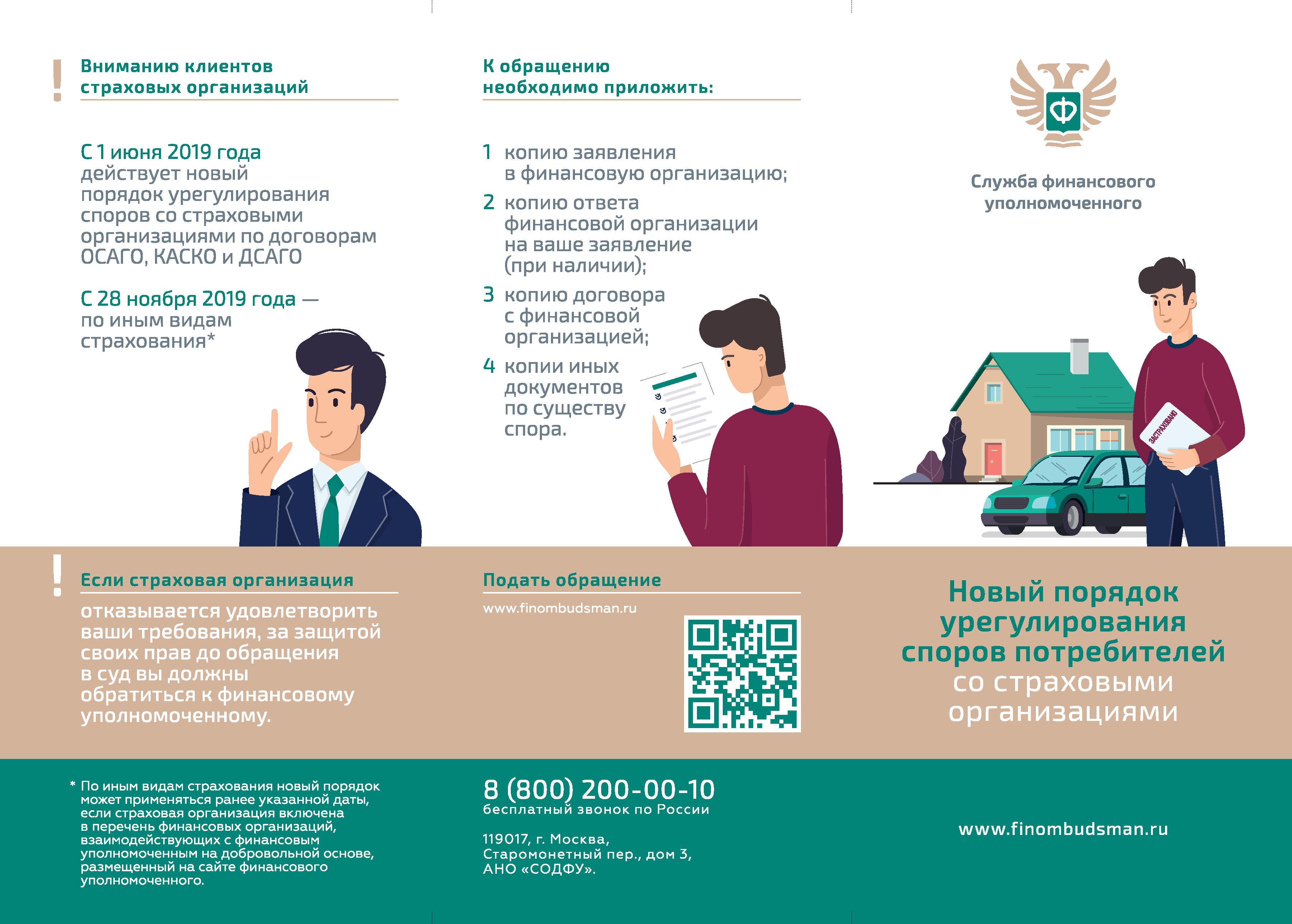 С 01.06.2019 года Федеральным законом от 04.06.2018г. №123-ФЗ «Об уполномоченном по правам потребителей финансовых услуг» установлен новый порядок урегулирования споров со страховыми организациями по договорам ОСАГО, КАСКО и ДСАГО, который является обязательным для потребителей: в случае, если страховая организация отказывается удовлетворить требования потребителя, за защитой своих прав до обращения в суд потребителю необходимо обратиться к финансовому уполномоченному https://finombudsman.ru/