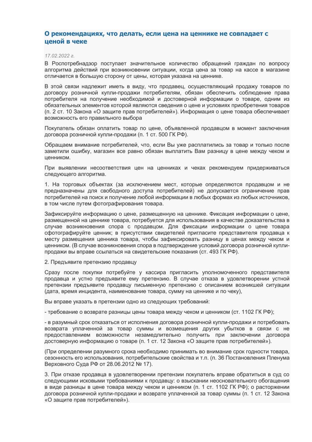 Цена не совпадает с ценником
