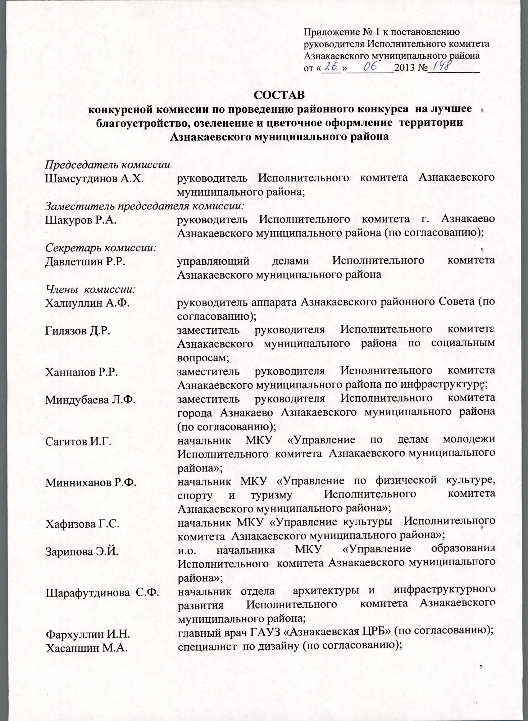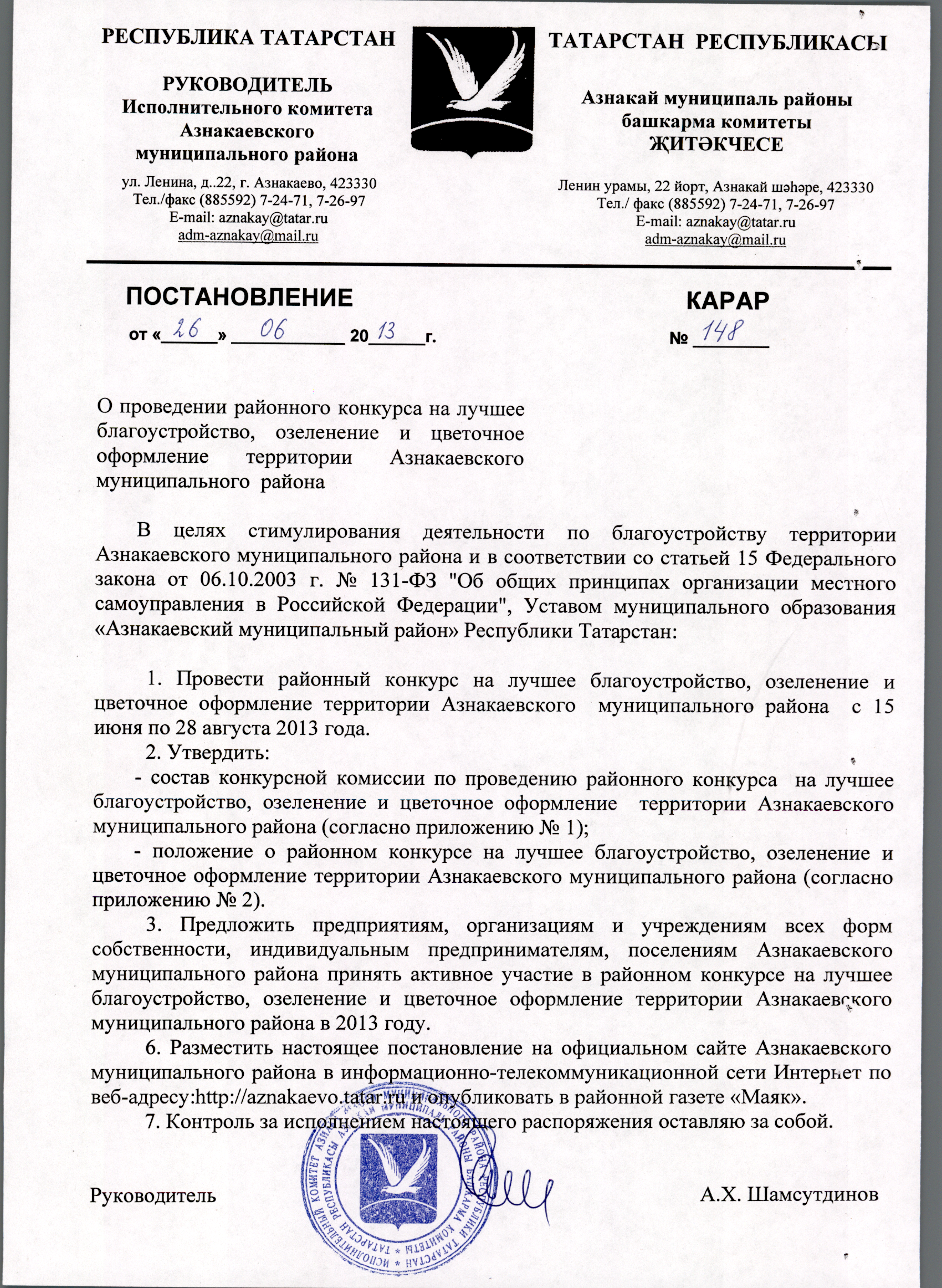 № 148 от 26 июня 2013 г. О проведении городского конкурса на лучшее благоустройство, озеленение и цветочное оформление территории Азнакаевского муниципального района