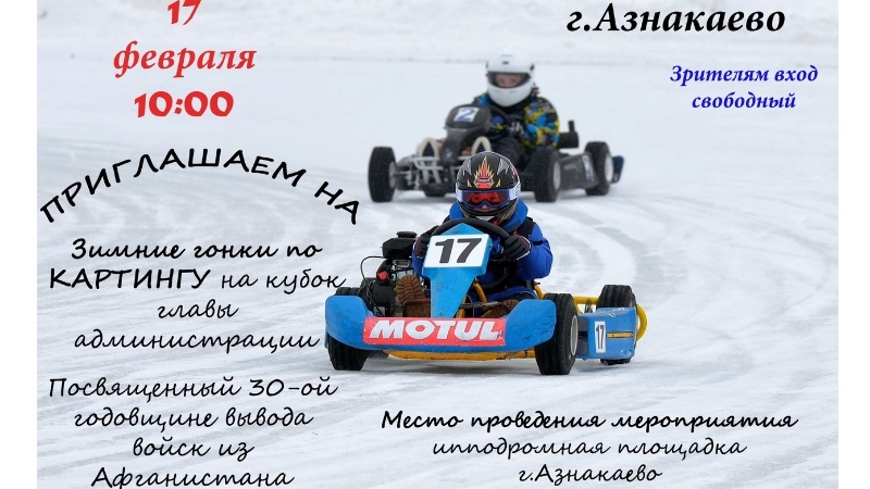 Бу якшәмбедә (2019 елның 17 февралендә) Азнакай ипподромы территориясендә, гаскәрләрне Әфганстаннан чыгаруга 30 ел тулуга багышланган, Азнакай муниципаль районы башлыгы кубогына картинг буенча кышкы узышлар узачак