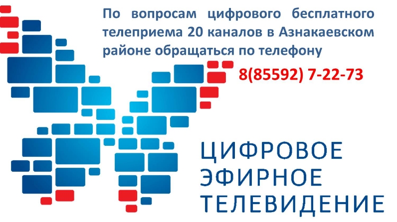 Азнакай муниципаль районында цифрлы телевидениене тоташтыруда ярдәм итә алырлык волонтерлар төркеме эшли. Волонтерлар ярдәме өчен Телефон 8(85592) - 7-22-73.
