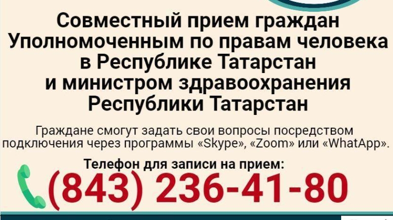 Кабул итүгә алдан язылу өчен (843) 236-41-80 телефоны буенча (Татарстан Республикасында Кеше хокуклары буенча вәкаләтле вәкилнең кабул итү бүлмәсе) кирәк.