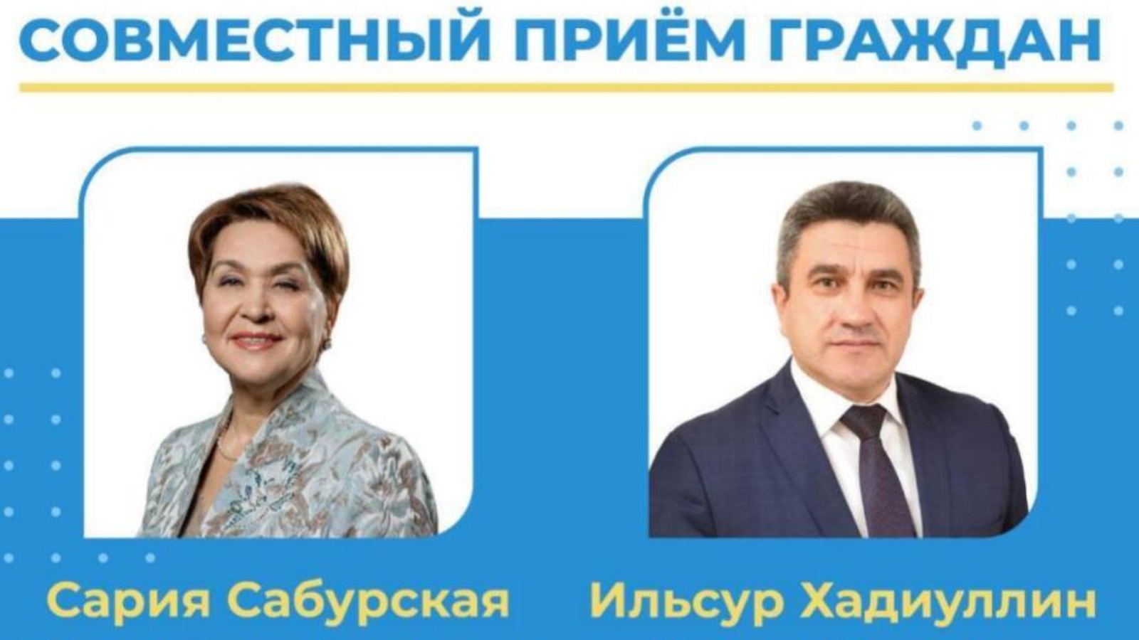 2021 елда Татарстан Республикасында Кеше хокуклары буенча вәкаләтле вәкил дәүләт органнары җитәкчеләре белән гражданнарны бергәләп кабул итү практикасы дәвам итә. 2021 елның 31 маенда 14.00 сәгатьтән 16.00 сәгатькә кадәр Татарстан Республикасында Кеше хокуклары буенча вәкаләтле вәкил Аппаратында (Казан шәһәре, Карл Маркс ур., 61 нче йорт) Татарстан Республикасында Кеше хокуклары буенча вәкаләтле вәкил һәм Татарстан Республикасы Мәгариф һәм фән министры тарафыннан гражданнарны бергәләп кабул итү оештырыла