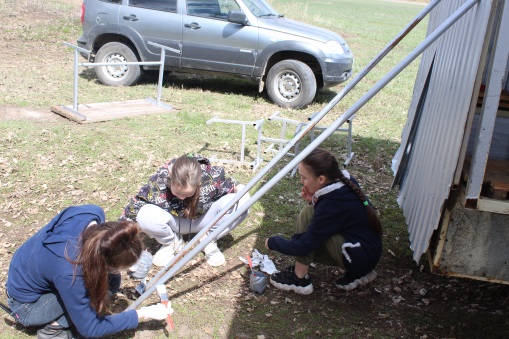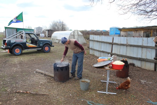Покрасили и обновили покраску: «вездеход автобус»; «мобимунча»; «мобикухня»; «прицепов катов», «боевое авто». После субботника пообедали костровым борщом и самоварным чаем.
